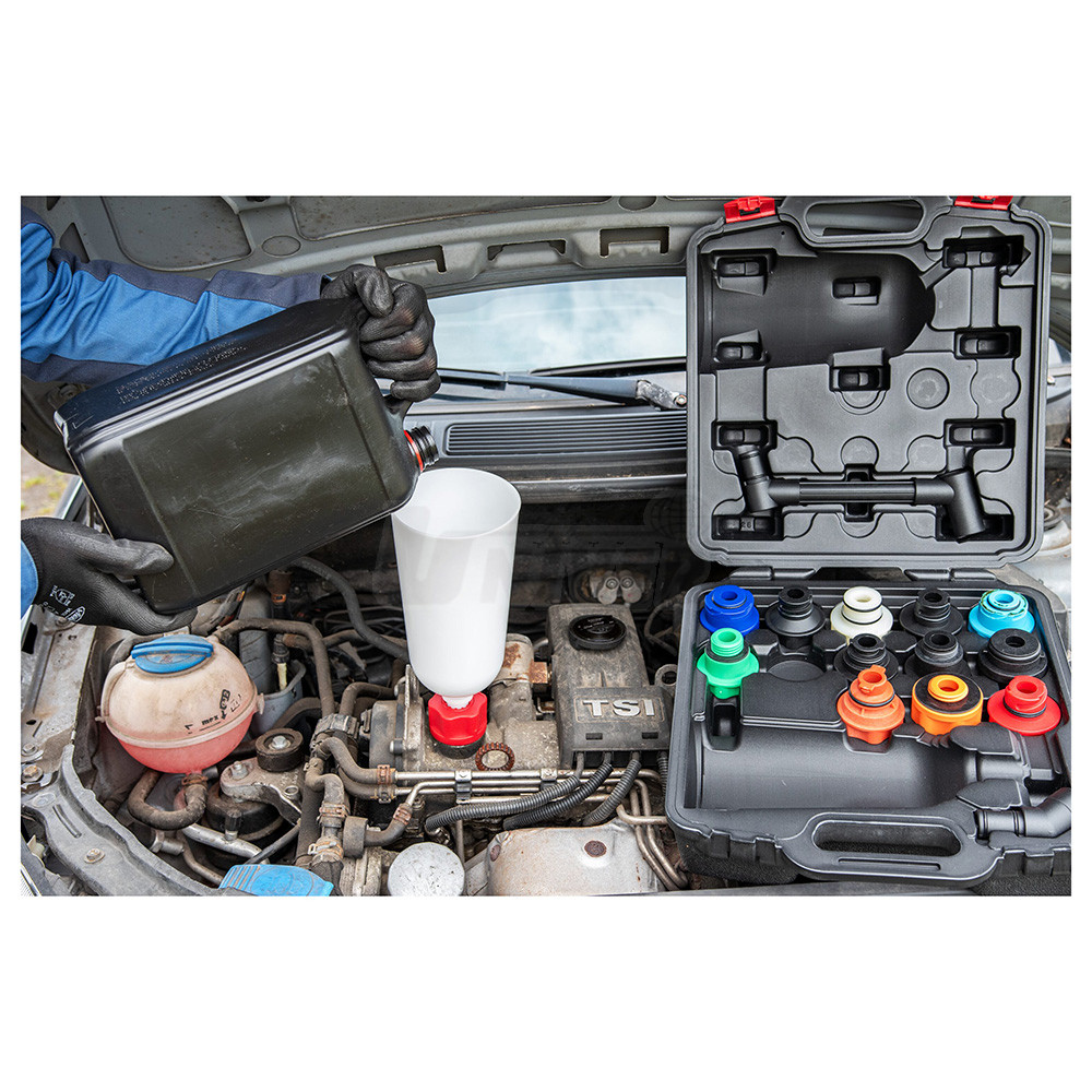 16-dílná sada adaptérů, plastové nádoby / trychtýře a úhlového prodlužovacího adaptéru v plastovém kufříku.- umožňuje nekomplikované, čisté plnění motorového oleje do příslušných plnicích otvorů