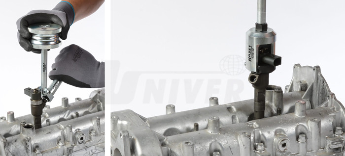 Sada přípravků (8-dílná) na demontáž vstřikovačů bez odstranění elektrických konektorů nebo hlavy vstřikovačů s pomocí rázového kladiva.- pro demontáž vstřikovačů Bosch, Delphi, Siemens a Denso