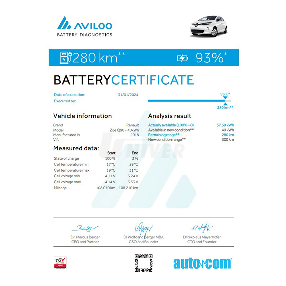 Test FLASH společnosti AVILOO, nezávislý průmyslový standard, také zaručuje nejrychlejší a nejpřesnější výsledek pro diagnostiku baterií DoIP EV / elektrických vozidel. Test AVILOO FLASH, který používají zákazníci po celém světě, je nyní schopen zaznamenávat data baterie z nové komunikační technologie vozidel DoIP a začlenit je do vlastních specifických a dynamických parametrů. Vygeneruje přesnou a spolehlivou podrobnou zprávu za pouhé tři minuty. Podle mezinárodní studie z roku 2024 poskytuje tento certifikát testování baterií AVILOO kupujícím elektrických vozidel jistotu, a proto má významný potenciál i pro maximalizaci zisku obchodníků s těmito vozidly.