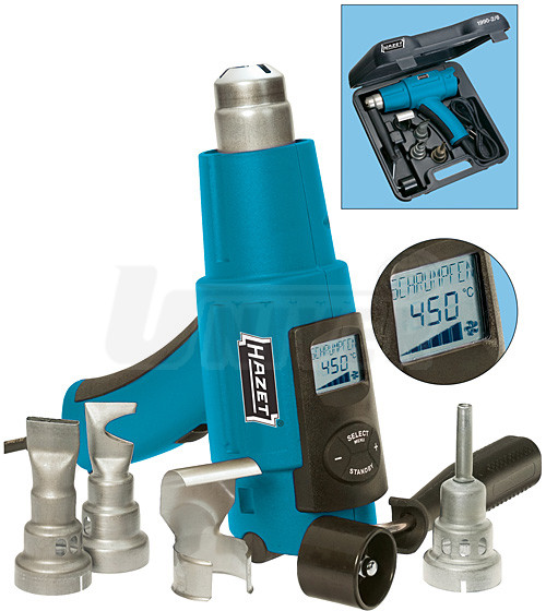 Teplovzdušná pištoľ s rôznymi funkciami a širokou škálou príslušenstva v plastovom kufríku má široké využitie v autoservisoch, remeselnej výrobe, pri montážnych prácach, zváraní plastov, odstraňovaní náterov atď. Pištoľ má moderný ergonomický tvar, je dokonale vyvážená, chránená plnou keramikou pre optimálnu izoláciu a má aj LCD displej. Súprava príslušenstva pozostáva zo 4 špeciálnych trysiek a prítlačného kolieska.Umožňuje 7 programovateľných nastavení na špeciálne zváranie (zadáva sa len materiál plastu, teplota a množstvo vzduchu sú už naprogramované). Možnosť Stand-By zabezpečuje len miernu spotrebu prúdu v úspornom režime pri konštantnej teplote. Výber menu je v 8 jazykoch (D,ES,FR,GB,IT,NL,PT,SE).