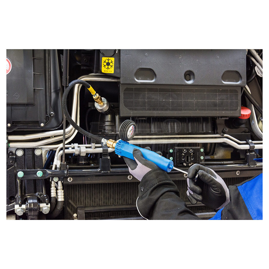 Přístroj pro zkoušení chladicích a topných systémů strojů užitkových vozidel je v provedení 8-dílné sady tvořené tlakovou pumpou s tlakoměrem, adaptéry a pružnou hadicí.- praktická sada pro testy chladicích systémů / chladičů a systémů topení užitkových vozidel