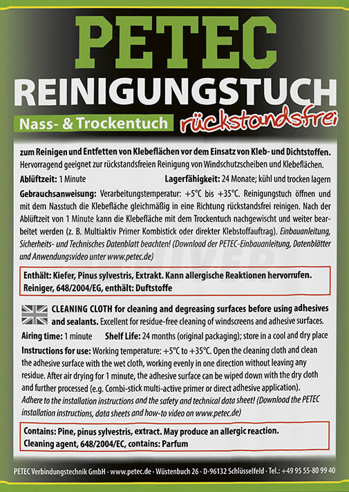 Teplota pro použití utěrky: +5°C až +35°C. Utěrka se rozbalí a plochy určené k lepení nebo tmelení se pomocí ní rovnoměrně v jednom směru očistí. Potom se nechá očištěná plocha 1 minutu odvětrat a může být dále upravena (např. pomocí přípravku PETEC Multiaktiv Primer Kombistick 82410, PETEC Schwarzprimer 82330, PETEC Aktivator 82230) nebo na ni být přímo naneseno lepidlo.