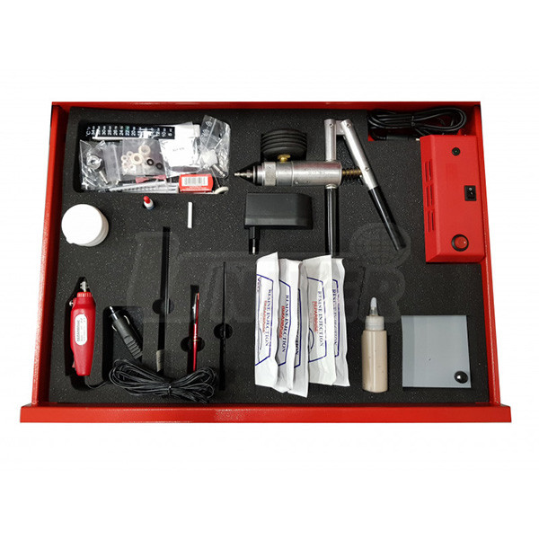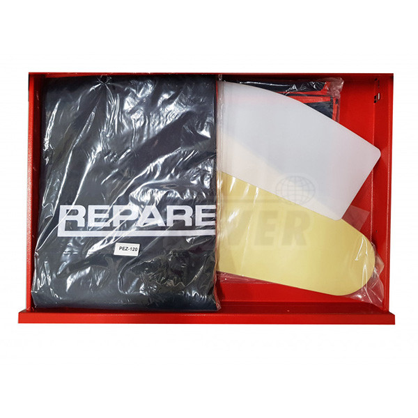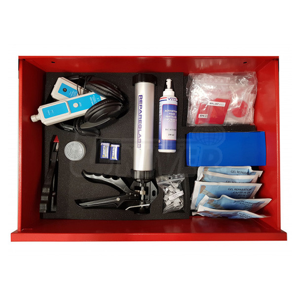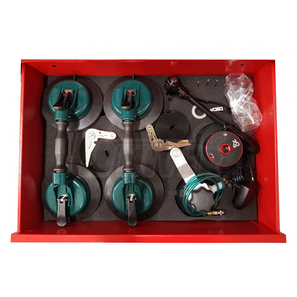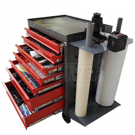 Dílenský vozík s nářadím, přístroji, přípravky a spotřebním materiálem pro opravy, montáž a demontáž čelních skel vozidel.Jednotlivé sady v zásuvkách vozíku (lze je zakoupit každou samostatně)