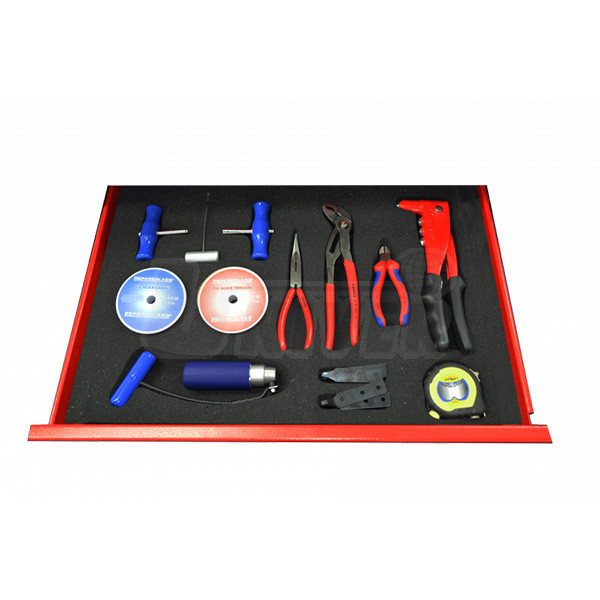 Dílenský vozík s nářadím, přístroji, přípravky a spotřebním materiálem pro opravy, montáž a demontáž čelních skel vozidel.Jednotlivé sady v zásuvkách vozíku (lze je zakoupit i každou samostatně)