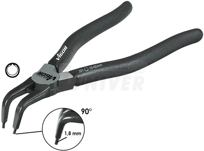 Zahnuté kleště (90°) na vnitřní pojistné kroužky jsou vyrobeny ze speciální oceli. Umožňují rychlou a bezpečnou práci s vnitřními pojistnými kroužky různého průměru. Mají odolné špičky, kvalitní pružiny a ergonomické rukojeti, což umožňuje vysoký přenos síly na čelisti.