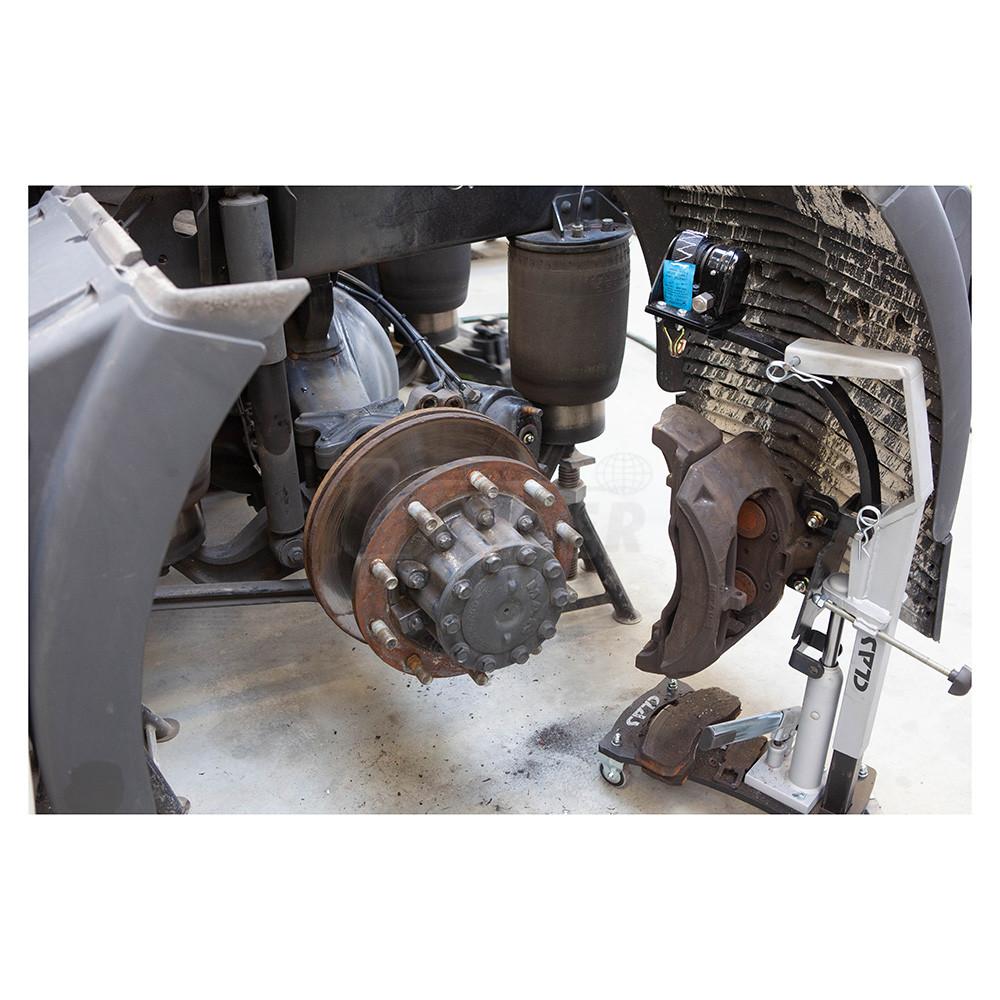 Zařízení pro demontáž nebo výměnu brzdových třmenů a bubnů kotoučových brzd nákladních automobilů.- osvědčené zařízení pro rychlejší demontáže či výměny brzdových třmenů a bubnů kotoučových brzd nákladních automobilů, autobusů a speciálních vozidel