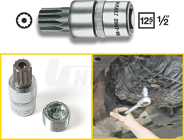 Speciální zástrčná hlavice 1/2" na vypouštěcí šrouby oleje z převodovek má tzv. "tisícihran" (Multi-SPLINE se středovým otvorem)i M16 dl. 60 mm. Je vyrobena z chrom-vanadia, pochromovaná. Používá se na šrouby, kterými se vypouští olej z převodovek vozů např. VW Passat B5, Golf 4, LT, T4, T5, Audi A2, A3, A4, A6, TT, Škoda Fabia, Octavia, Superb, Porsche Boxster, Ford Galaxy 1,9 TDI se šestistupňovou převodovkou.Objednávka tovaru