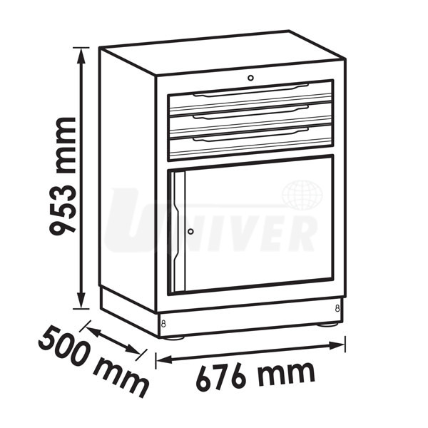 Celokovová dílenská skříň se 3 zásuvkami a jednokřídlými dveřmi.- shodné se sérií L