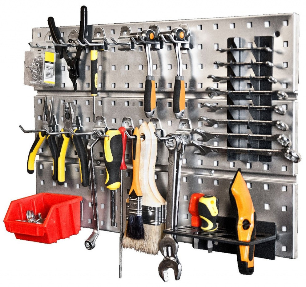 Kovová děrovaná deska pro zavěšení nářadí, nástrojů, organizérů, boxů pomocí různých držáků, háčků atd.- používá se buď v horizontální nebo ve vertikální poloze především k instalaci na stěnu