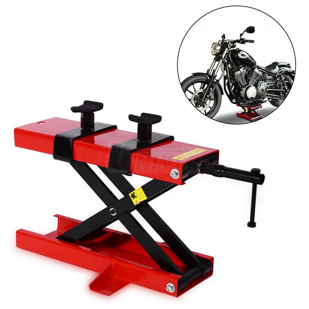 Malý šroubový zvedák s nůžkovou zvedací konstrukcí pro zvedání motocyklů při jejich profesionální údržbě a opravách.- šroubový nůžkový zvedák pro motocykly s nosností 500 kg