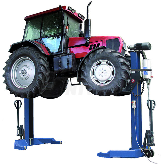 Zostava 2 pojazdných kolesových zdvihákov pre traktory (vozidlá s veľkým priemerom kolies) firmy MAHA Maschinenbau Haldenwang GmbH & Co. KG.- 2 pojazdné kolesové zdviháky pre traktory s ovládacou skrinkou odolnou proti striekajúcej vode s ovládaním na každom jednotlivom zdviháku zostavy