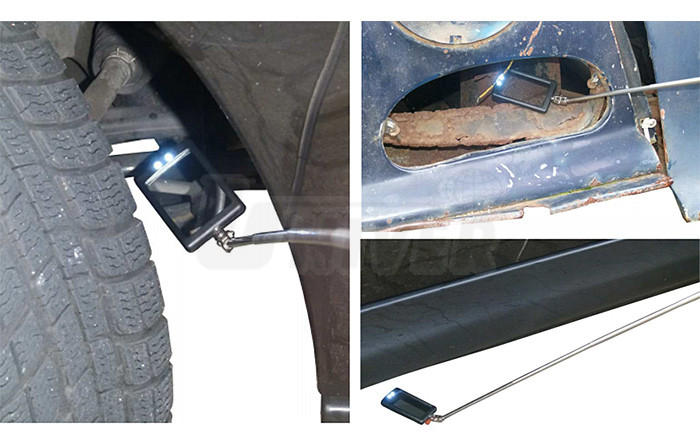 Speciální zrcátko s LED osvětlením pro ohledávání obtížně přístupných míst, například místa poškození nebo koroze karosérií, spodní části karosérií, ale také na stavbách, v průmyslu, v domácnostech apod. Má dlouhé výsuvné/teleskopické držadlo, na kterém je speciální kloub dovolující natáčení zrcátka (o 360° vertikálně a o 250° horizontálně). LED-osvětlení umožňuje sledovat zejména prostory, kde je nedostatek denního světla. Výsuvné držadlo usnadňuje kontroly, aniž by se pozorovatel musel nepřirozeně či namáhavě shýbat.Parametry: