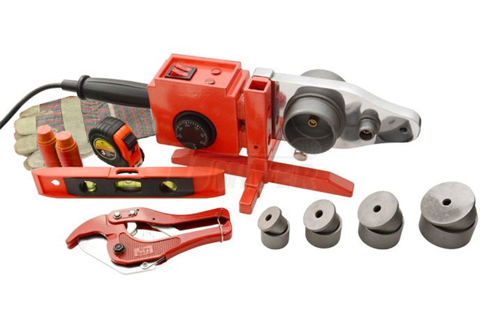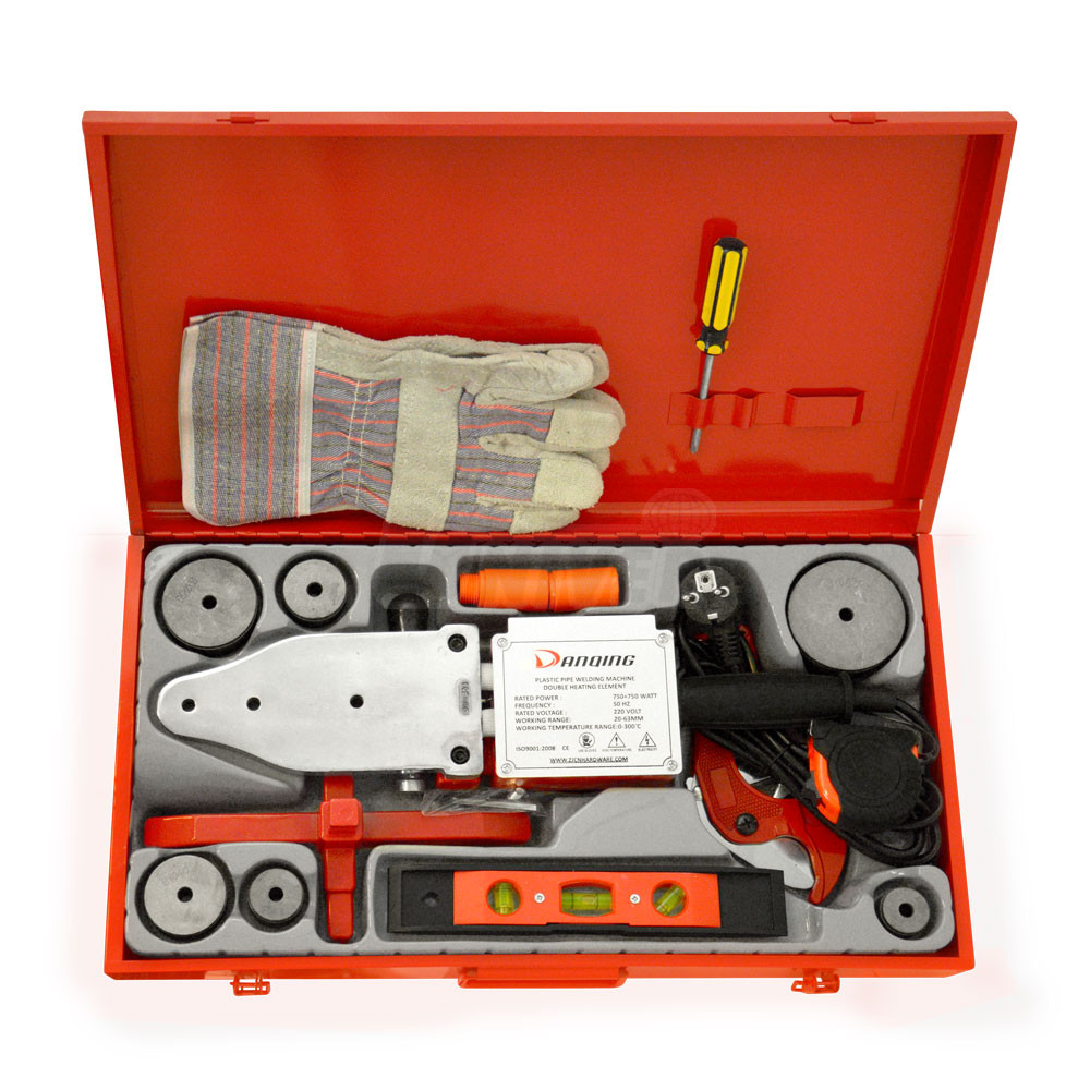 Instalatérská sada v plechovém kufru obsahuje svářečku plastových trubek 700 W /1500 W 0-300°C, 6 nástavců Ø 20-63 mm, stojan, řezačku trubek, vodováhu, svinovací metr, pracovní rukavice, šroubovák a klíč.- pro polyfúzní svařování všech termoplastických materiálů, zejména spojování plastových trubek (nejčastěji z PP, PE, PB, PPC, PPR nebo PVDF) pomocí tvarovek v rámci instalačních prací, především vnitřních rozvodů vody a topení