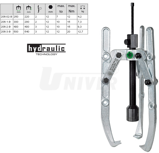 3-ramenné hydraulické stahováky s výkyvnými háky a nastavitelnou hloubkou upnutí německé firmy KUKKO-Werkzeugfabrik patří do nejvyšší kvalitativní třídy v Evropě.Vlastnosti: