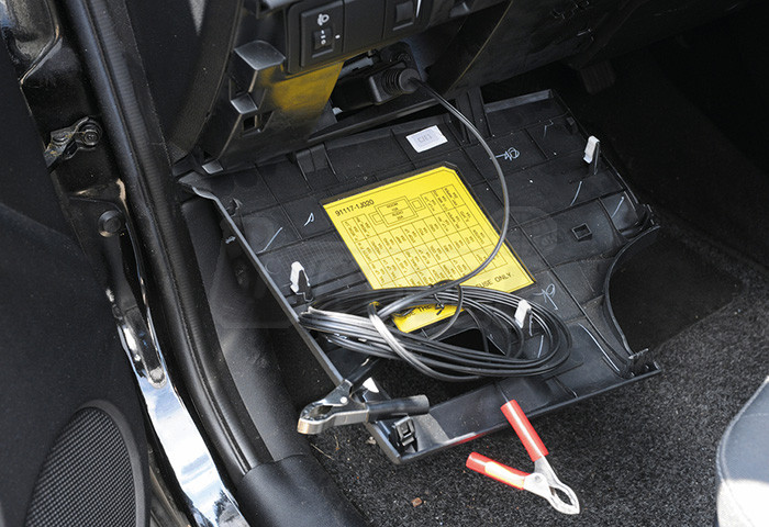 - zapojuje se přímo na přípojku / zásuvku OBD a na druhé straně pomocí kabelů s krokosvorkami na externí baterii 12 V