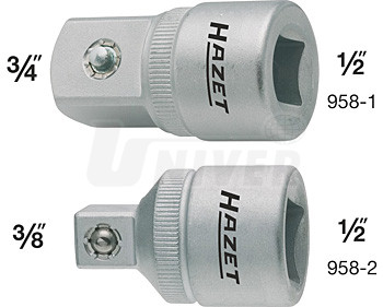 Adaptéry HAZET 958-1 (z 1/2" na vývod 3/4") a 958-2 (z 1/2" na vývod 3/8") jsou vyrobeny z vysoce kvalitního chrom-vanadia s pochromovaným povrchem. Splňují požadavky DIN 3123 a ISO 3316