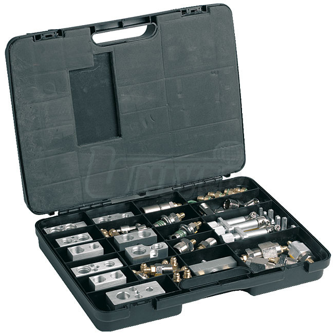 65-dílná sada adaptérů pro překlenutí součástí klimatizace, např. expanzních ventilů a kompresorů..