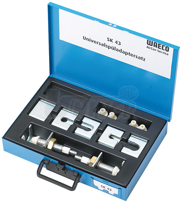 18-dílná sada adaptérů se používá při proplachování klimatizací, aniž by bylo nutné vypouštět chladicí prostředek.