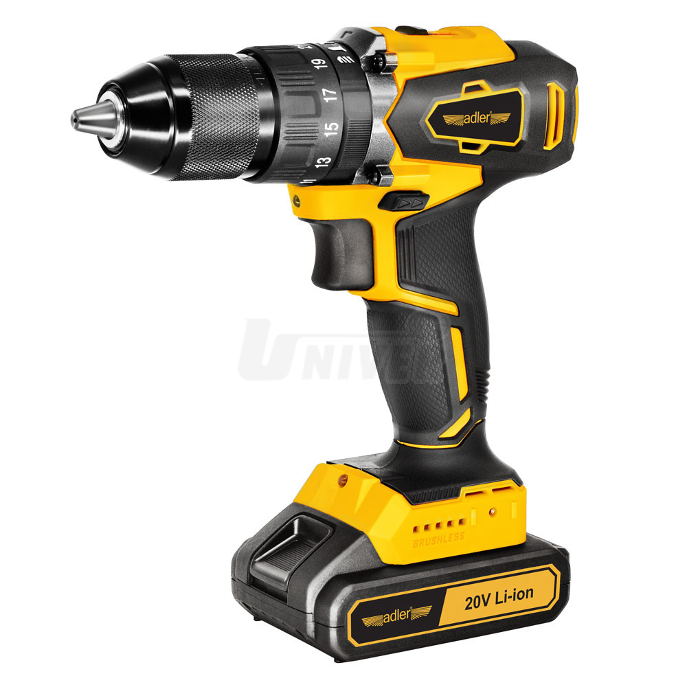 Akumulátorová příklepová vrtačka / šroubovák s bezkartáčovým motorem, Li-Ion baterií 20 V / 2 Ah, pro vrtáky průměru 2 - 13 mm, s dvoustupňovou převodovkou a LED svítilnou.- profesionální akumulátorový vrtací šroubovák se 3 funkcemi: vrtání, šroubování a příklepové vrtání, hodí se i pro náročné práce