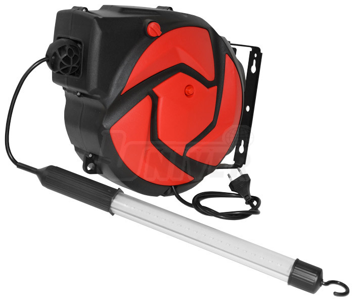 Automatický kabelový naviják pro upevnění na stěnu, strop nebo jinou konstrukci je vybavený el. kabelem dl. 14 m, montážní LED lampou 230 V.- skříň ze speciálního plastu na bázi PP odolného proti nárazům i povětrnosti