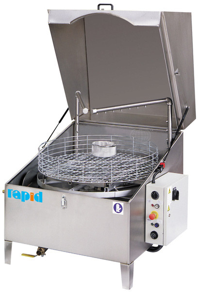 Automatický mycí/čisticí stroj TWA 280 německého výrobce Rapid Maschinenfabrik GmbH je určený pro vysoce kvalitní mytí/čištění horkou vodou s biologicky odbouratelným čisticím prostředkem velkých předmětů, jako jsou např. součástky v autoopravnách, díly strojů v průmyslové údržbě apod. Toto moderní zařízení odstraňuje oleje a mastné nečistoty perfektně za krátkou dobu. Vzhledem k integrovanému časovému spínači, nastavitelnému termostatu a seřízeným tryskám lze mycí proces nastavit zcela optimálně.Mytí/čištění předmětů je velmi jednoduché. Mycí zásobník se naplní směsí vody a čisticího prostředku. Znečištěné součásti se vloží na rotující mycí koš a uzavře se víko stroje. Poté se naprogramuje požadovaná doba a teplota mytí/čištění. Ve stroji rotuje ponorný koš a čerpadlo ostřikuje znečištěné předměty vysokým tlakem čisticí kapaliny přes důmyslně uspořádaný systém trysek. Rotace koše, mechanické a chemické působení mycího prostředku v kombinaci s teplotou a příslušnou dobou mytí - to je ideální kombinace pro zajištění dokonalého mytí/čištění.