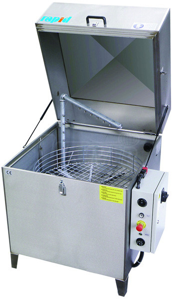 Automatický mycí /čisticí stroj TWA 90 německého výrobce Rapid Maschinenfabrik GmbH je určený pro vysoce kvalitní mytí/čištění horkou vodou s biologicky odbouratelným čisticím prostředkem předmětů, jako jsou např. součástky v autoopravnách, díly strojů v průmyslové údržbě apod. Toto moderní zařízení odstraňuje oleje a mastné nečistoty perfektně za krátkou dobu. Vzhledem k integrovanému časovému spínači, nastavitelnému termostatu a seřízeným tryskám lze mycí proces nastavit zcela optimálně.Mytí/čištění předmětů je velmi jednoduché. Mycí zásobník se naplní směsí vody a čisticího prostředku. Znečištěné součásti se vloží na rotující mycí koš a uzavře se víko stroje. Poté se naprogramuje požadovaná doba a teplota mytí/čištění. Ve stroji rotuje ponorný koš a čerpadlo ostřikuje znečištěné předměty vysokým tlakem čisticí kapaliny přes důmyslně uspořádaný systém trysek. Rotace koše, mechanické a chemické působení mycího prostředku v kombinaci s teplotou a příslušnou dobou mytí - to je ideální kombinace pro zajištění dokonalého mytí/čištění.
