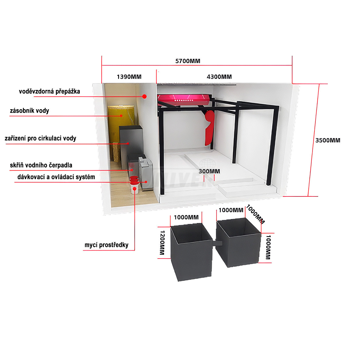 - ako voliteľné príslušenstvo je možné dodať farebný vodopád peny s ovládaním intenzity a farieb, nástenný vysávač, prípadne recirkuláciu vody (70 % - 80 %) atď.