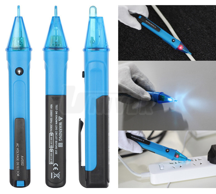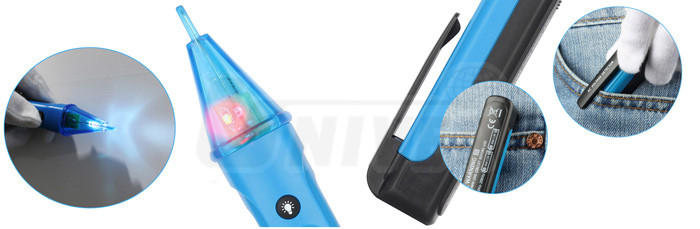 Praktická bezkontaktní zkoušečka střídavého napětí (90 - 1000 V) se zvukovou (pípání) a světelnou (LED) indikací napětí a bílým LED osvětlením.- indikace napětí zvuková (pípání) a světelná (LED)
