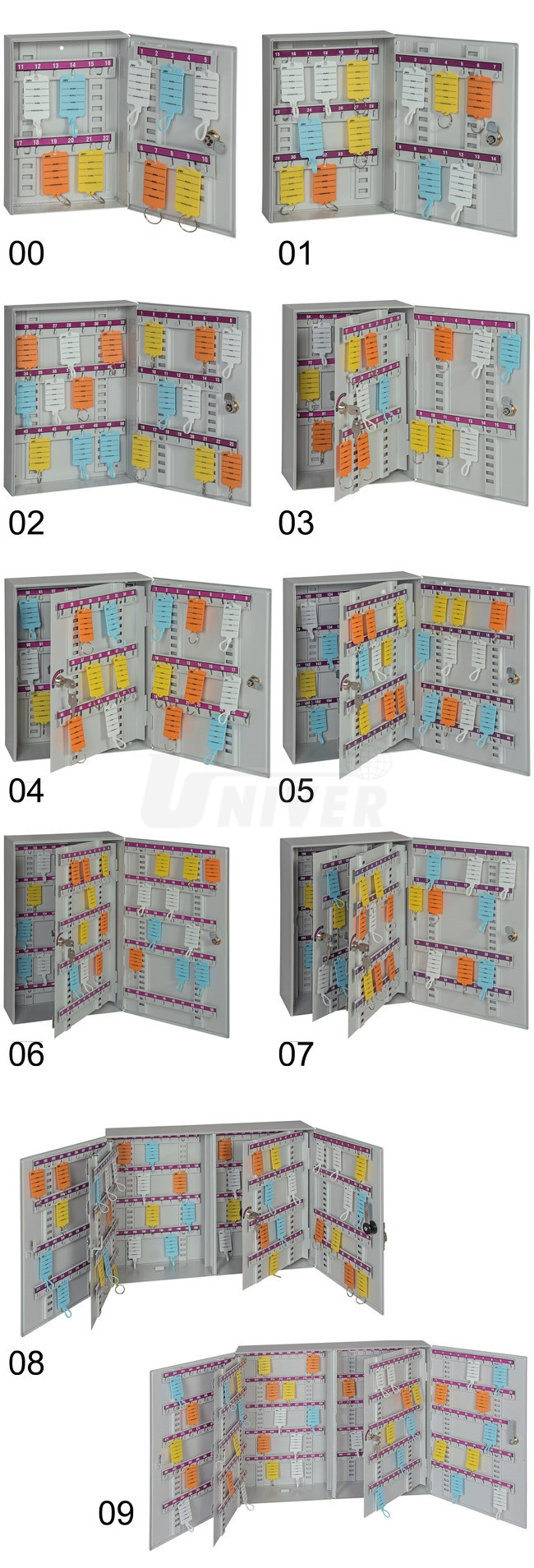 Bezpečnostní skříňky na klíče v 10 různých velikostech pro bezpečné ukládání až 400 klíčů jsou vyrobené z kvalitního ocelového plechu.- 10 různě velkých bezpečnostních skříněk na klíče (od 0 do 400 klíčů)