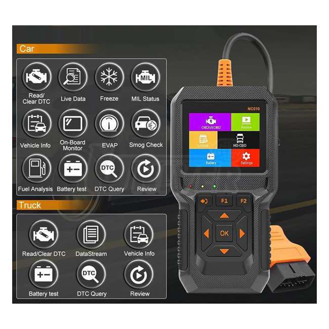Prístroj na diagnostiku osobných aj nákladných automobilov so 16-pinovým (OBDII) aj 9-pinovým konektorom (HD-OBDJ1939) pokrýva zhruba 90 % vozidiel európskej, ázijskej a americkej výroby po roku 1996.- prístroj je možné používať pre väčšinu vozidiel kompatibilných s OBDII po roku výroby 1996