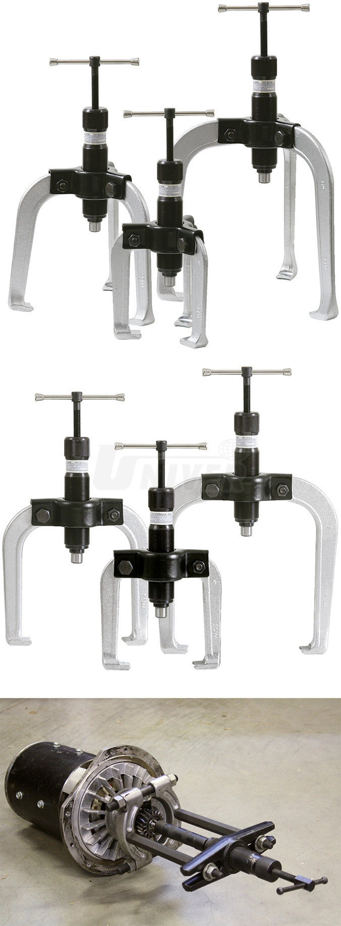 22-dílná sada univerzálních hydraulických stahováků 2- i 3-ramenných (8 variant) s kvalitní hydraulickou jednotkou / vřetenem.- 22-dílná sada 2- a 3-ramených stahováků pro profesionální univerzální použití