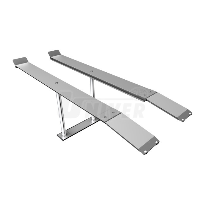 Dvoupístový hydraulický podpodlažní zvedák s nosností 3,5 t, se 2 plošinami dl. 4550 mm, šířky 500 mm, vzdáleností mezi plošinami 950 mm a se vzdáleností pístních jednotek 1380 mm.- vodicí i opěrný píst tvrdě pochromované