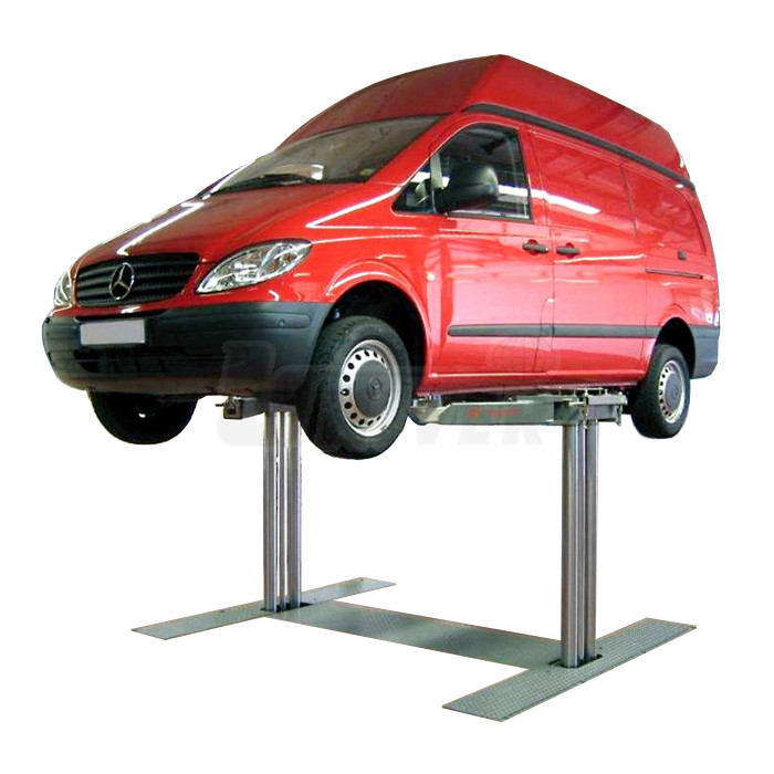 Dvoupístový hydraulický podpodlažní zvedák s nosností 5,5 t, se vzdáleností pístních jednotek 2500 mm, s volitelnou horní nosnou částí se 4-dílnými otočnými a délkově nastavitelnými nosnými rameny.- vodicí i opěrný píst tvrdě pochromované
