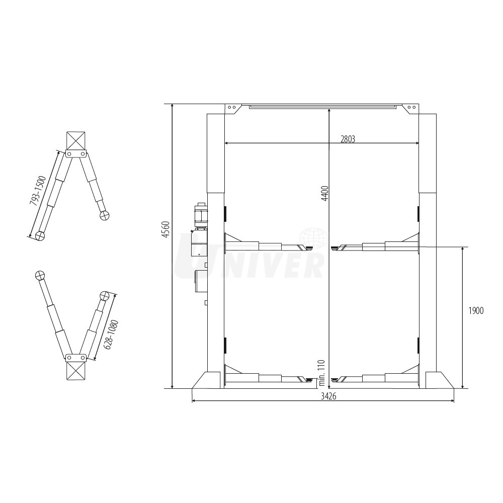 asymetrická, variabilně nastavitelná, dvoustupňová krátká i dlouhá nosná ramena s automatickou aretací polohy jejich natočení, snadno tak lze dosáhnout zvedací body u menších i velkých automobilů