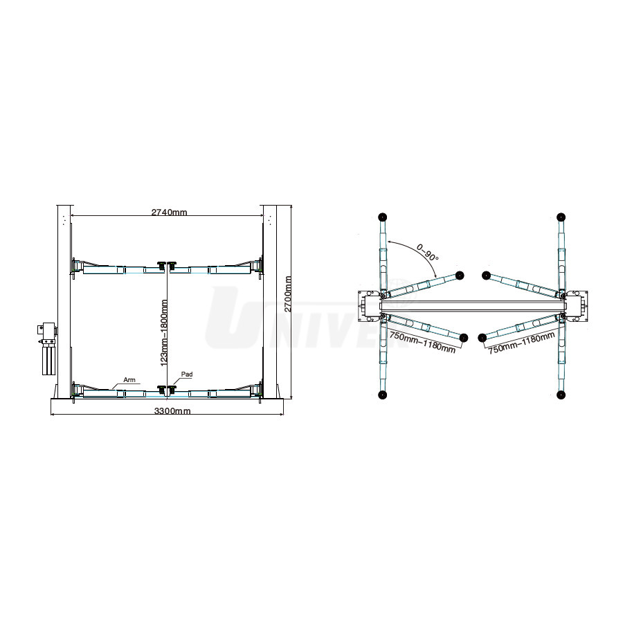 asymetrické, variabilné nastavenie zdvíhacích ramien (výsuvné a kĺbové) s automatickou aretáciou ich otočnej polohy, takže možno ľahko dosiahnuť body zdvihu pre menšie aj väčšie vozidlá (napr. SUV atď.)