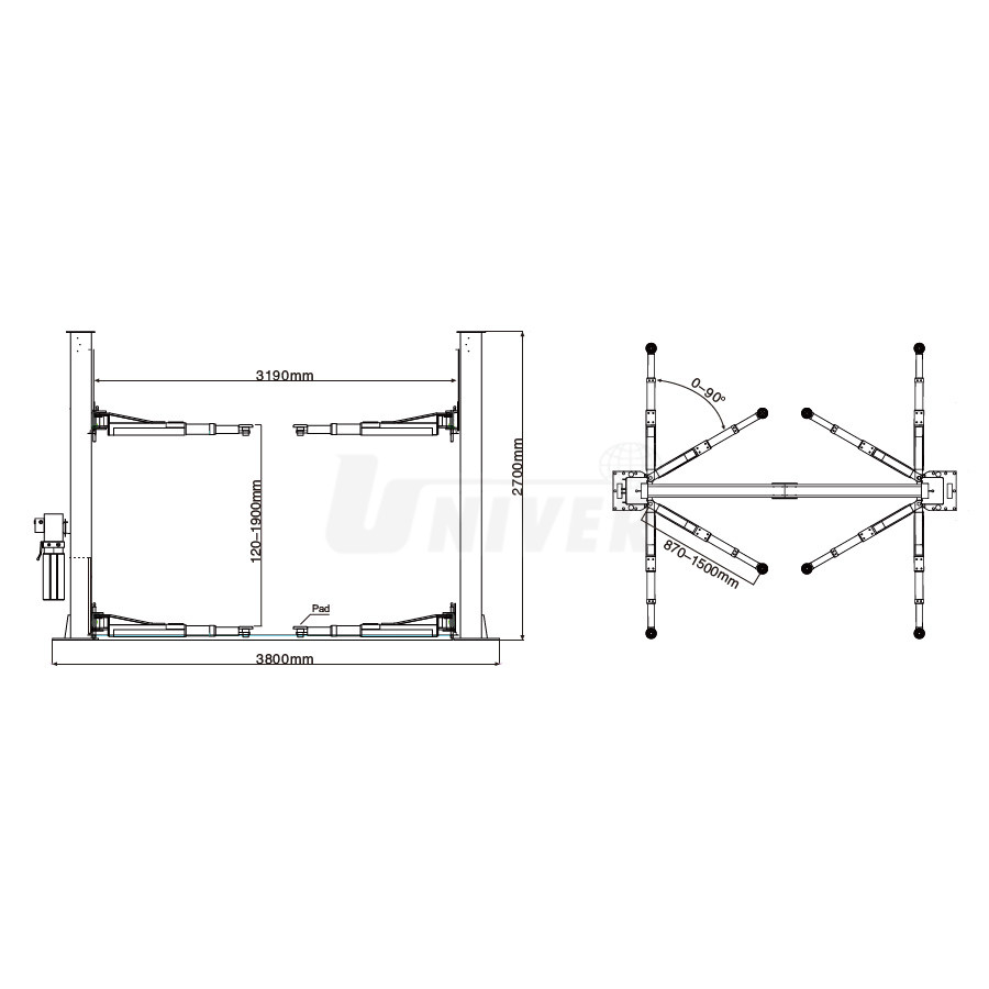 asymetrické, variabilné nastavenie zdvíhacích ramien (výsuvné a kĺbové) s automatickou aretáciou ich otočnej polohy, takže možno ľahko dosiahnuť body zdvihu pre menšie aj väčšie vozidlá (napr. SUV atď.)