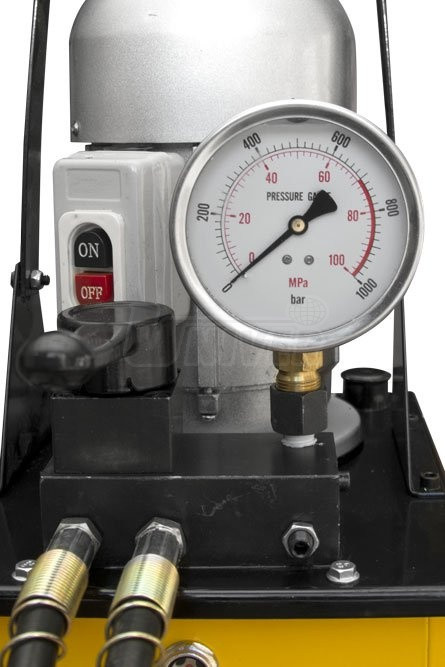 Elektrická dvourychlostní hydraulická pumpa s ručním ovládáním, se spodním olejovým zásobníkem, s přídavným tlakoměrem a s vysokotlakými hadicemi pro pohon dvojčinných hydraulických válců, různých hydraulických zařízení, rozpínáků, stahováků, hydraulických lisů, nůžek atd.- kvalitní elektrická dvourychlostní hydraulická pumpa pro pohon dvojčinných hydraulických válců, různých hydraulických zařízení