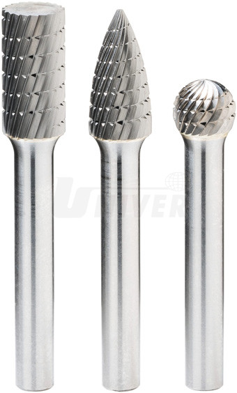 3 tvrdokovové frézovací kolíky s frézami válcového, kuželového a kulového tvaru s dříky Ø 6 mm pro univerzální použití v kovoobrábění téměř všech materiálů