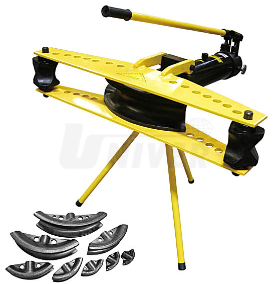 Přenosná hydraulická ohýbačka ocelových trubek a trubek z barevných kovů o průměru 1/2", 3/4", 1", 1-1/4", 1-1/2", 2", 2-1/2", 3" má stojan a vyznačuje se tuhou konstrukcí, ohýbací silou 20 t a úhlem ohybu až 90°.- pro ohýbání trubek z běžné oceli, nerezových trubek, trubek z barevných kovů apod.