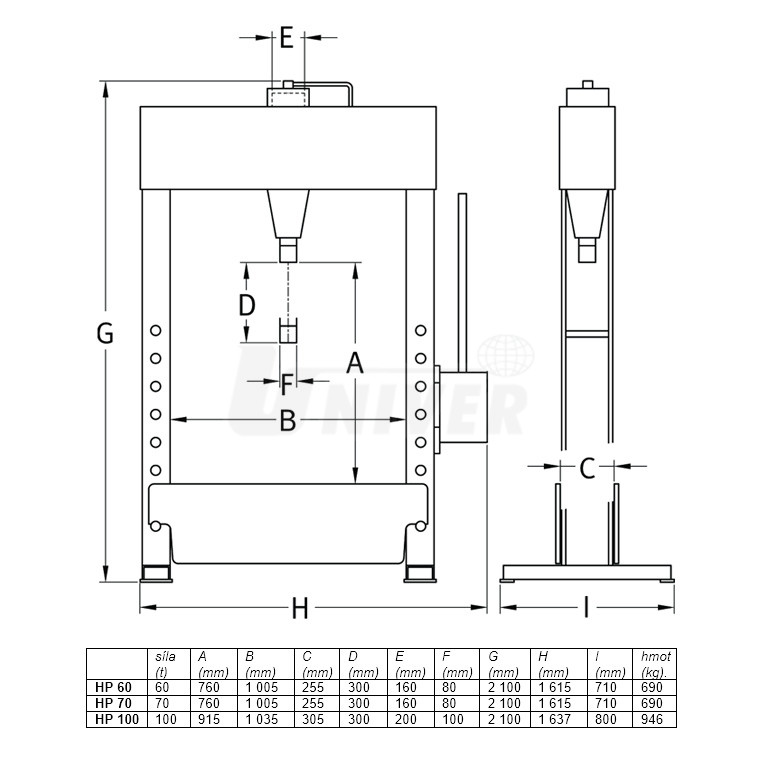 Ruční hydraulické lisy s lisovací sílou 60 / 70 / 100 t s manuálním ovládáním pro univerzální použití.- velký tvrdochromovaný píst