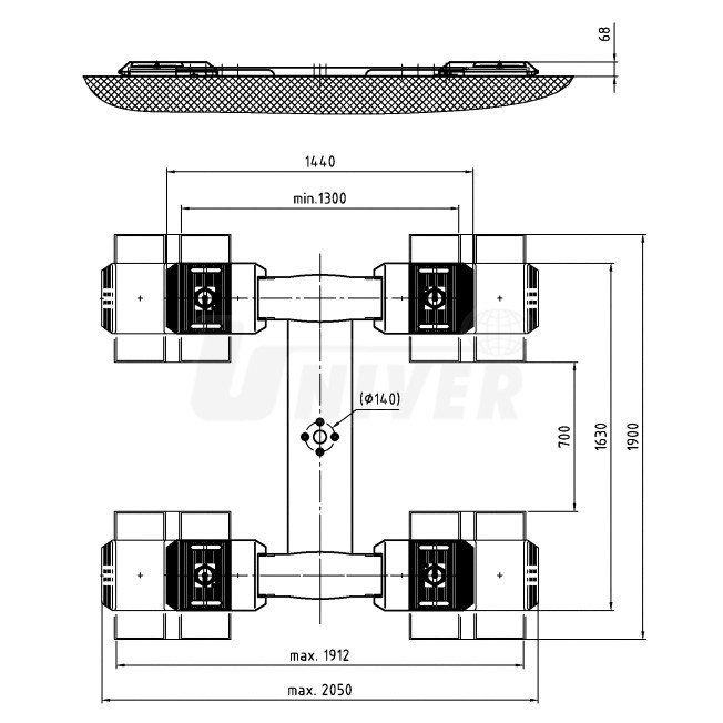 Nosnost 3,5 t, výška zdvihu cca 1868 mm, přejezdná výška cca 68 mm, rozsah nosných ramen 1300 – 1912 mm (podélně), 700 – 1900 mm (příčně).
