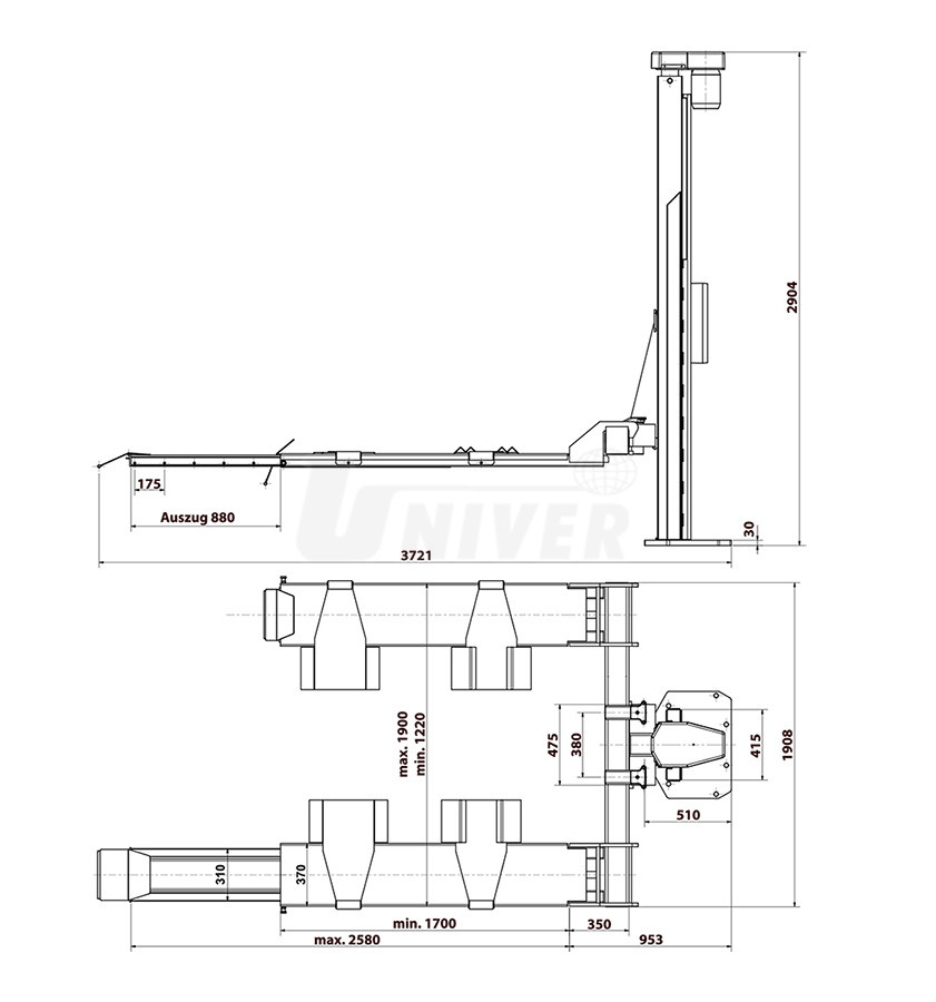 Jednosloupový elektromechanický zvedák s nosností 1500 / 1000 kg pro zvedání menších zahradních strojů, čtyřkolek, malých užitkových komunálních vozidel apod.- podélně nastavitelné základní nosníky (při jejich plném vysunutí nosnost 1000 kg)