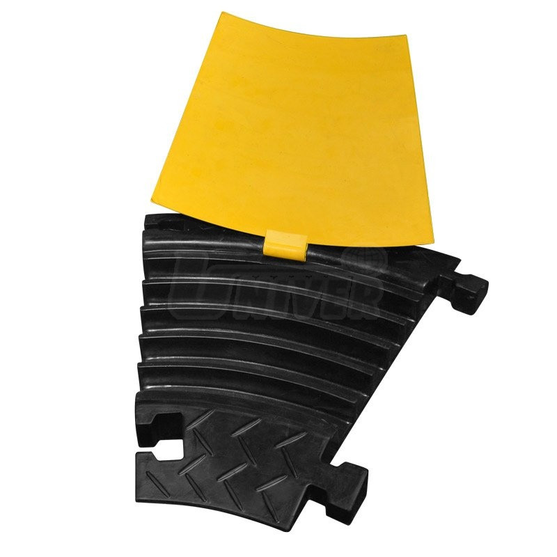 Pryžový kabelový přejezd / segment oblouk 30° s 5 kanálky a víkem slouží k ochraně kabelů, hadic, trubek atd., které jsou položené přes vozovku, chodníky, vnitřní komunikace v objektech apod.- kabelový most pro ochranu kabelů, hadic, trubek atd. položených na zpevněném povrchu