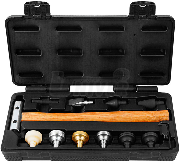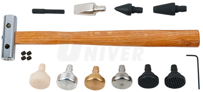 Sada (14-dílná) v plastovém kufříku obsahuje univerzální karosářské kladivo s kovovými i plastovými výměnnými hlavami.- univerzální karosářské kladivo s 9 výměnnými hlavami, se zahnutým imbus-klíčem a se 4 fixačními šroubky