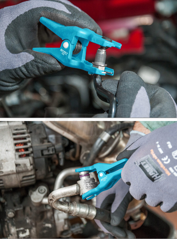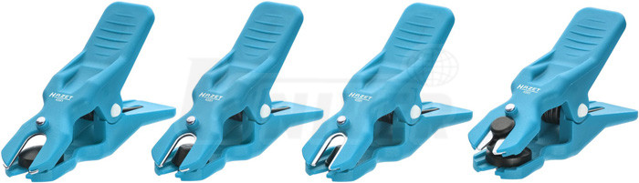 Sada 4 různě velkých a tvarovaných kleštin pro uzavření / ucpání trubičkových vedení brzd, klimatizace, servořízení, palivového systému atd..- 4 kleštiny pro uzavření / ucpání trubičkových vedení řady provozních kapalin (palivo, brzdy, řízení atd.)