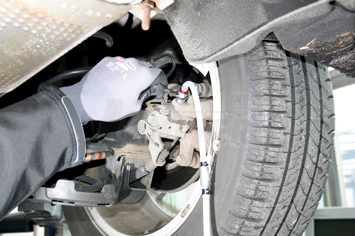 6-dílná sada krátkých 12-hraných klíčů pro odvzdušňování brzd bez demontáže kol doplněné silikonovou hadičkou (120 cm) se zpětným ventilem.- silikonová hadička se zpětným ventilem pro zamezení zpětného toku použité brzdové kapaliny a odčerpaného vzduchu