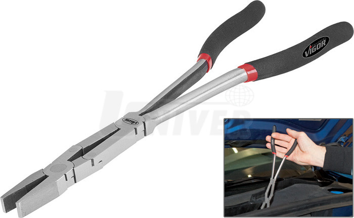 Prodloužené kombinované kleště se zdvojeným kloubem jsou vyrobeny ze speciální oceli. Jsou extrémně úzké, mají délku 300 mm a ergonomické rukojeti, což umožňuje vysoký přenos síly na čelisti. Používají se jak pro přidržování, tak i pro štípání zejména v obtížně přístupných místech.Objednávka tovaru