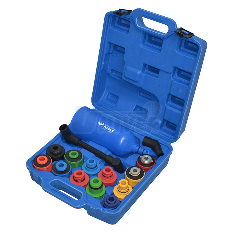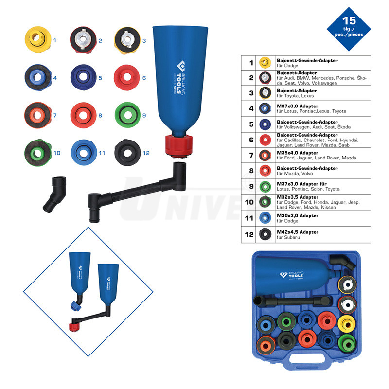 Sada v úložném boxu obsahuje trychtýř (2 l), otočné úhlové rameno a 12 adaptérů pro rychlé a čisté plnění olejů do motorů.