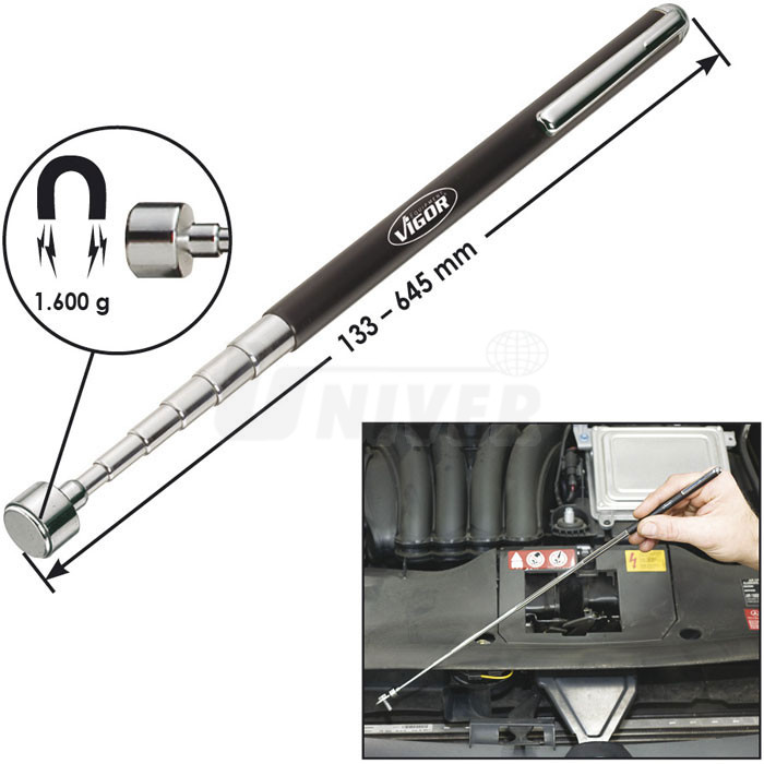 Magnetický teleskopický podavač zapadlých součástí VIGOR V1741 vysoké kvality (dceřiná firma HAZET/Německo) má výsuvnou tyčku v rozsahu 133 - 645 mm na konci s magnetem Ø 11 mm, který je schopen zachytit zapadlé součásti o hmotnosti až 1600 gramů.