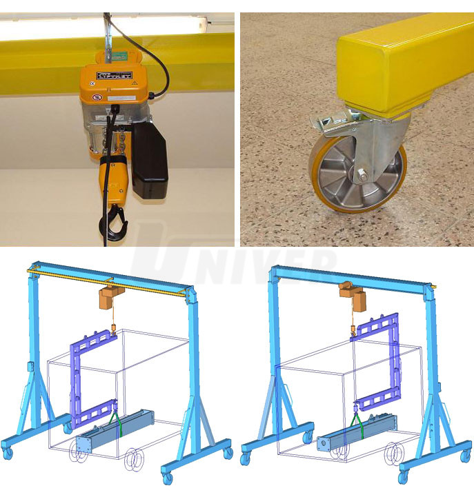 s elektrickým kladkostrojem a ručním pojezdem, nosnost 1000 kg, světlá šířka 3000 mm, celková výška 3500 mm.